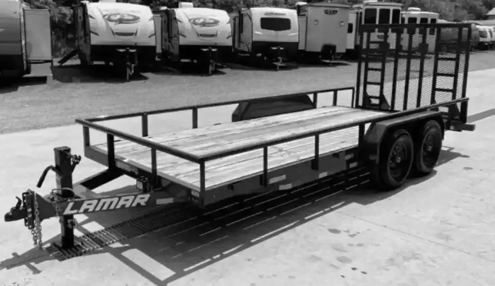 Built for heavy-duty hauling, this 20' Lamar HD utility trailer features a 10,400 lb GVW, dual axles, and a spring-assisted ramp for easy loading of equipment and materials.